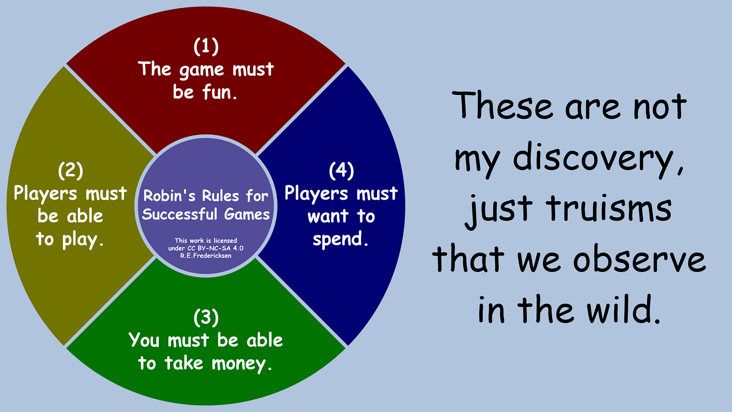 In the beginning I only had the first three rules, but then my friend Loic Claveau called attention to free-to-play (F2P) games. In the F2P world, even if the first three rules are met, players must still WANT to spend money.